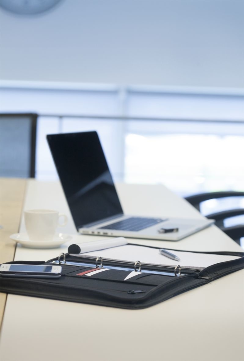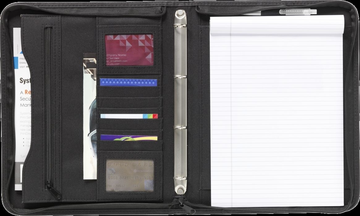 A4-schrijfmap. Aan de rechterbinnenkant is de map geschikt voor een A4-schrijfblok, aan de boven- en onderkant erin te schuiven. Deze map is voorzien van een harmonicavak waar uitstekend een tablet in vervoerd kan worden en diverse opbergvakken voor A4- en A5-documenten, voor visitekaartjes en creditcards.Deze map wordt inclusief pen en schrijfblok geleverd. Diameter ringband: 2 cm