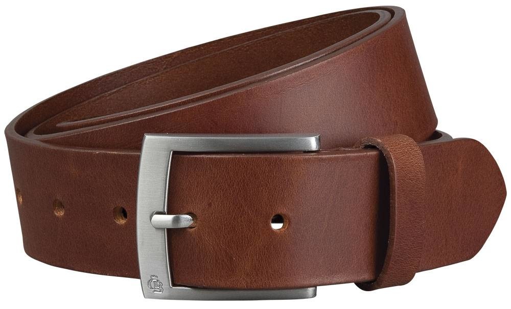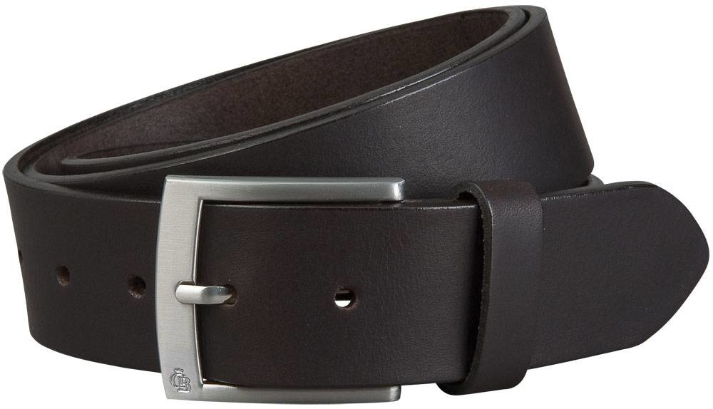 Herenriem van runderleer met een stijlvolle gesp in geschuurd rvs-look. De riem is 105 cm lang en 4 cm breed en is eenvoudig op maat te maken met een schroefsysteem. Deze leren riem is verkrijgbaar in de kleuren cognac, zwart en mocca.