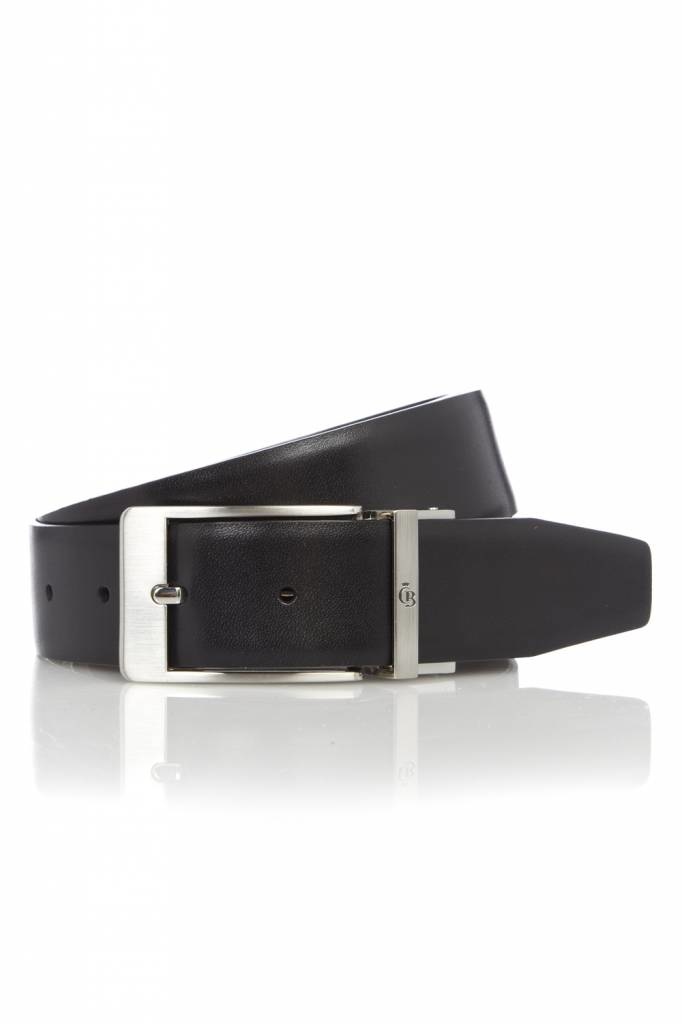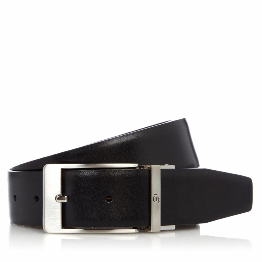 Deze herenriem van runderleer met een stijlvolle zilverkleurige draaigesp is door het eenvoudig omdraaien van de gesp aan twee zijden te dragen: een zijde is zwart, de andere zijde is donkerbruin. De riem is 105 cm lang en 3,5 cm breed en is eenvoudig op maat te maken met een kliksysteem. Deze leren riem is verkrijgbaar in de kleuren zwart en donkerbruin.