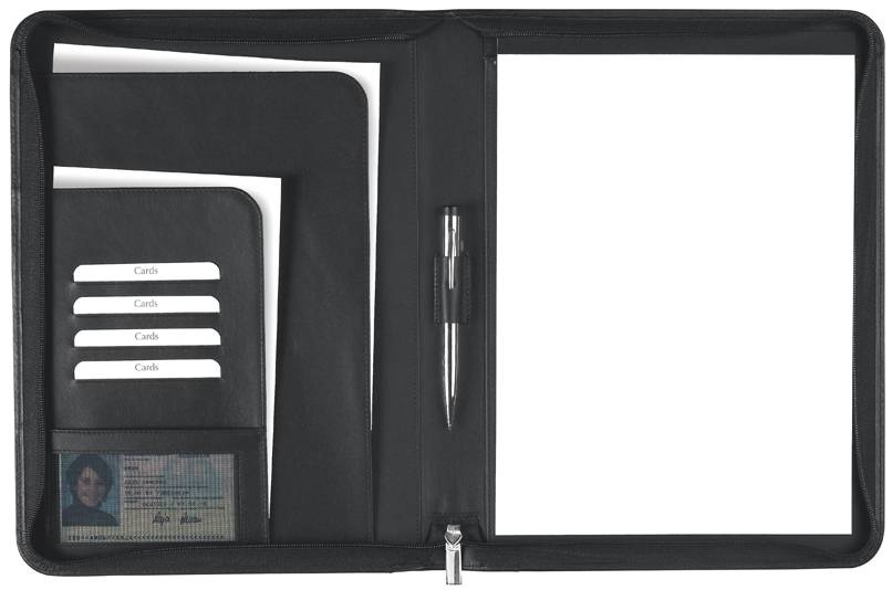 Soepele, schrijfmap van rundleder/nappa met ritssluiting. Deze map heeft aan de linkerzijde een groot insteekvak A4, een medium insteekvak, 4 insteekvakjes voor uw pasjes of creditcards en 1 zichtvakje voor uw ID. Aan rechterzijde is ruimte voor een schrijfblok A4.