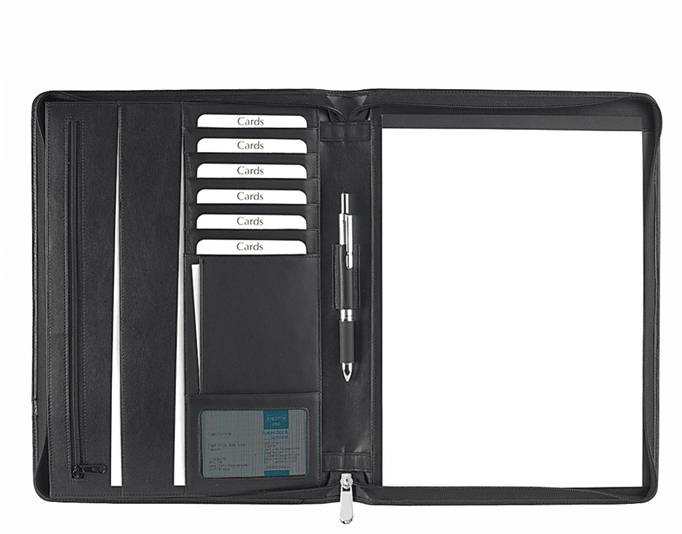 Mooie rundlederen A4-schrijfmap met ritsluiting. Aan de binnenkant rechts mogelijkheid voor A4-schrijfblok, en links opbergmogelijkheden voor visitekaartjes, creditcards, persoonlijke documenten zoals rijbewijs of paspoort. Tevens heeft deze map 2 grote insteekvakken en een extra insteekvak met rits. (zie detailfoto). Deze map wordt geleverd met gratis schrijfblok