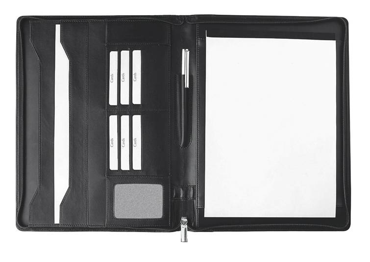 Mooie A4 schrijfmap, deze map heeft diverse insteekvakken A4voor documenten, creditcards, visitekaartjes en een penhouder met aan de rechterzijde ruimte voor schrijfblok. De schrijfblok wordt gratis meegeleverd.
