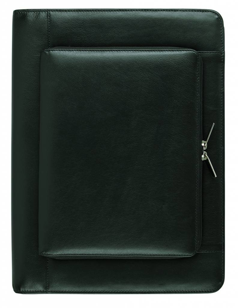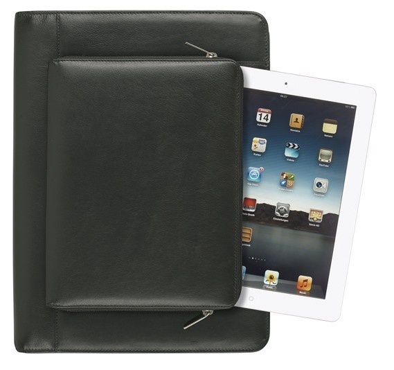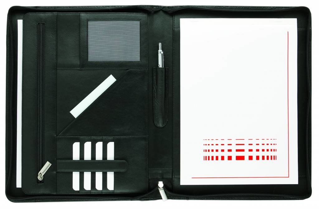 Schrijfmap A4 van soepel leer met rits. Deze map heeft diverse vakken voor creditcards en visitekaartjes op te bergen, een pennenhouder en wordt incl. schrijfblok geleverd. Speciaal IPad vak met rits.