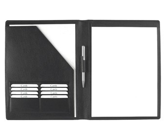 Prachtige schrijfmap A4 van mooi rundsleder. Deze map heeft een schrijfblok aan de rechterzijde, een penhouder in het midden en aan de linkerkant 8 insteekvakjes voor uw pasjes of creditcards en een groot insteekvak A4 voor uw documenten.